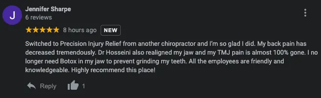Disclaimer: Procedures and treatments performed by Precision Injury Relief have an inherent success (and failure) rate. Reviews, testimonials and content on this site should not be interpreted as a statement of efficacy of procedures and treatments performed by Precision Injury Relief for anyone else.